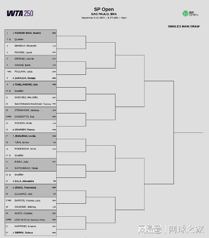 我们再来关注本周的赛事。北京时间昨晚,WTA250巴西圣保罗站公布了正赛签表。本土一姐玛雅作为头号种子领衔出战。谢拉、伊埃拉、汤姆贾诺维奇等球员也将参赛。