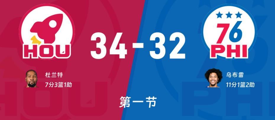 一上来76人先攻马克西三分抬手打铁,申京传球失误乔治反击暴扣,奥科吉分球又差点失误球掉到阿门手里也扣一球,杜兰特打了乔治一个3+1,乌布雷内外开花连得5分回应7-6开局!恩比德失误火箭三线快攻得手,马克西三分打铁76人退防不及时史密斯轻松快攻吃饼,埃奇库姆隔扣申京锁定五佳球,回过来申京外线试试有了13-9,乔治内线吃火锅杜兰特转换造成犯规两罚一中。乌布雷单打申京到内线2+1打成他是76人开局阶段发挥最好的球员,奥科吉、史密斯接连投中三分火箭打了一波6-0将比分改写成29-12打停76人!回到比赛恩比德篮下吃饼,埃奇库姆三分开火大了一波5-3将比分追到17-22,恩比德内线自投自抢分差回到一个球权,进攻好了防守积极性就起来了76人防成火箭24秒,火箭连续打铁马克西转换三分比分打成22平,末段双方连中三分伊森压哨抛投不中34-32领先2分!