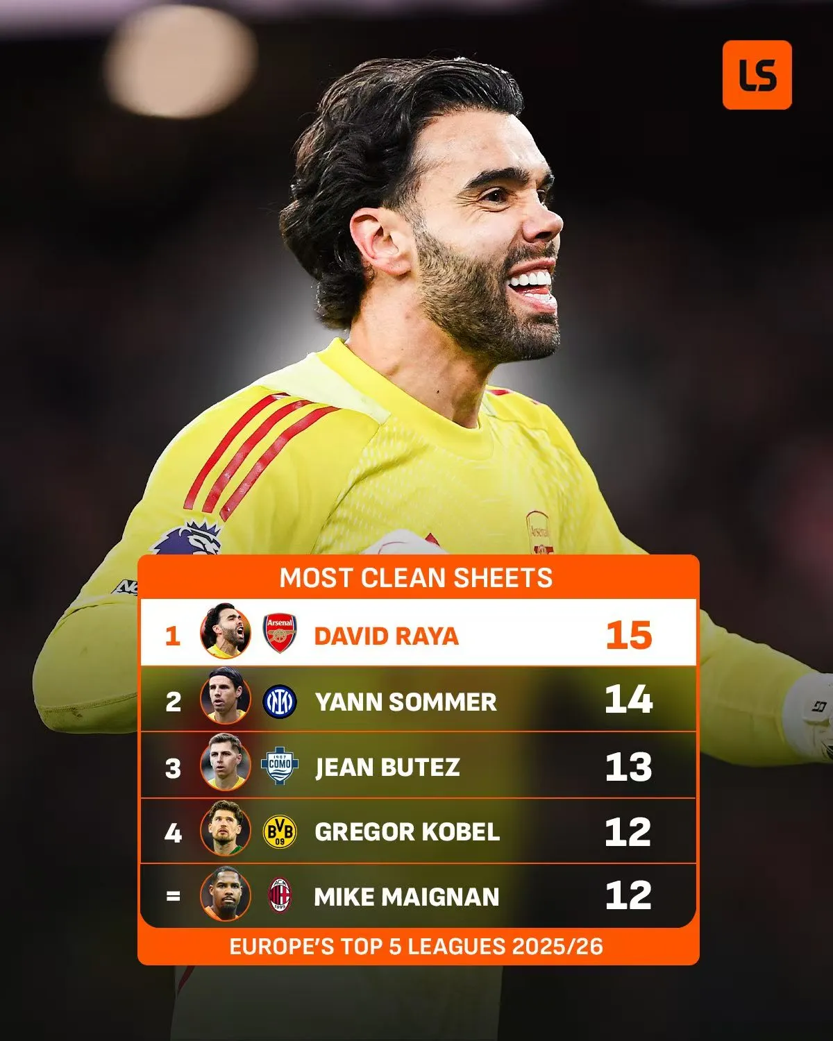 数据显示,这是本赛季拉亚第15次零封,登顶五大联赛门将之首。