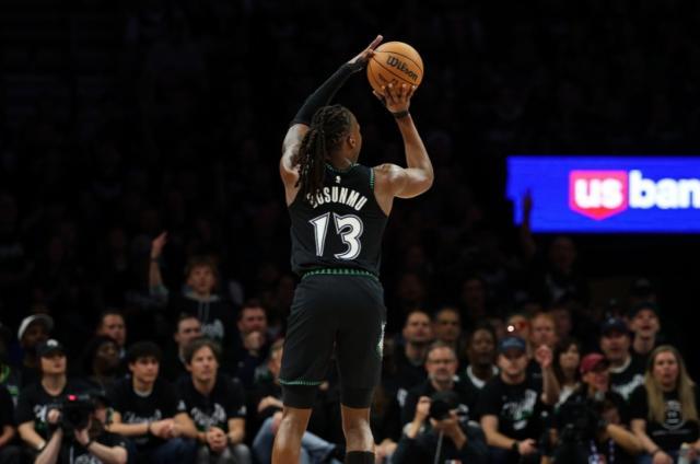下半场临危受命首发登场的他,全场17投13中,砍下43分,这不仅是多苏姆季后赛生涯的最高分,也是本赛季季后赛到目前为止的联盟单场最高分,力压亚历山大。多苏姆成为了森林狼队史首位单场比赛以至少75%投篮命中率拿到40+得分,并且5记三分球全部投中,12次罚球全部罚中的球员,包括常规赛和季后赛。