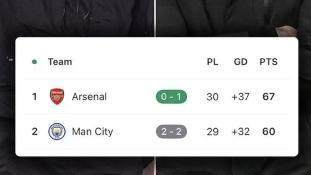 上轮联赛结束后,少赛一场的曼城只落后阿森纳4分。考虑到曼城阿森纳接下来还有一场直接对话,曼城实际上掌握了争冠的主动权。但是,今日凌晨的比赛结束后,曼城则将主动权让给了阿森纳。