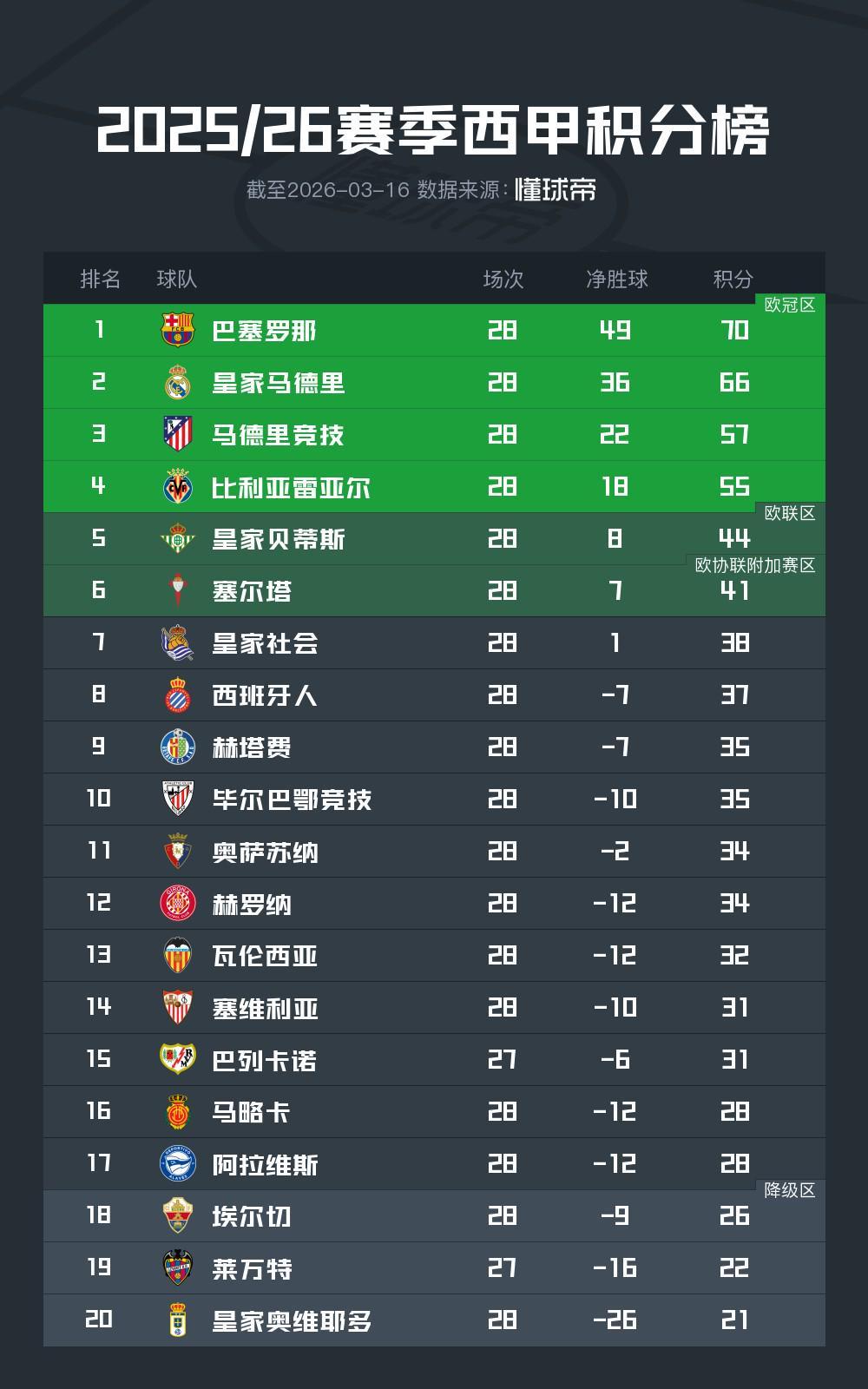 开云体育APP下载-西甲前28轮积分榜:巴萨领先皇马4分领跑,马竞欧冠资格无忧