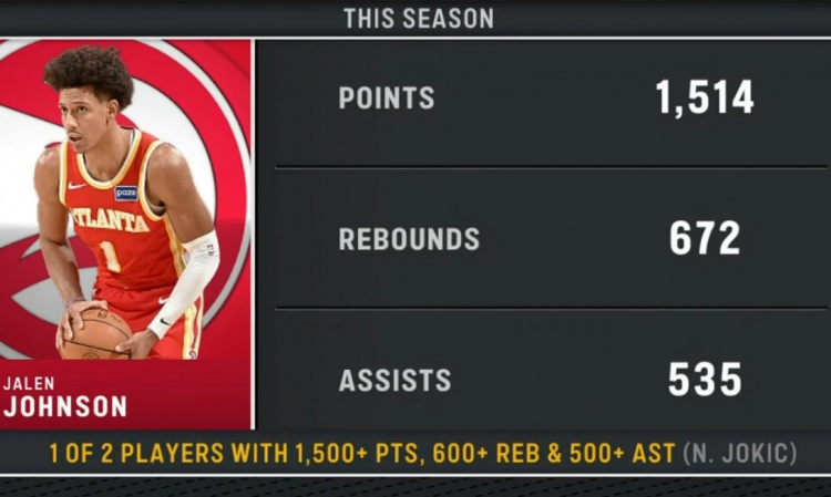 开云娱乐游戏-本赛季仅两人达成至少1500分600板500助:杰伦·约翰逊 约基奇
