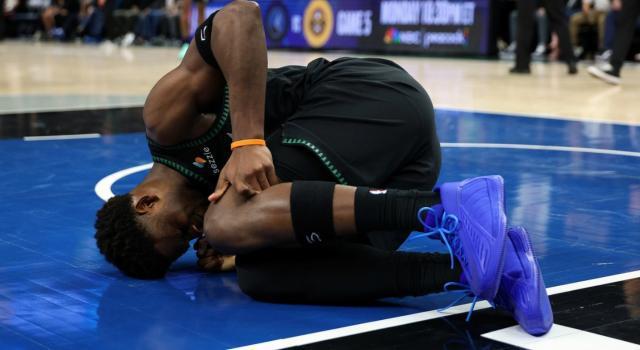 带着2比1的领先在主场开启系列赛第四战,森林狼意气风发。但在比赛开始后不到两分钟,这支球队便遭遇重创。迪文琴佐在一次逼抢球权的过程中,无对抗倒地。从慢动作回放来看,迪文琴佐右腿蹬地启动的一瞬间,小腿接近跟腱位置出现了不自然抽动,与杜兰特跟腱重伤前的情况极为相似。